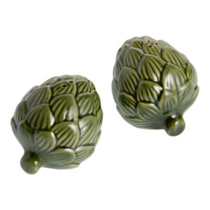 Our artichoke-shaped salt and pepper shakers are artisan-crafted of stoneware with fine attention to textural detail in tonal dark green. Visually tactile and vibrant with a glossy glaze, this figural serveware set refreshes the dining table with a tactile touch of garden-fresh character. Expertly shaded to create their ripe appeal, these splendid seasoning shakers will…