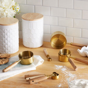 Our two-tone measuring cup and spoon sets feature rustic wooden handles and bright golden-yellow bowls that nest together for easy storage. These mixed-material kitchen tool sets are reliably accurate and a pleasure to use.