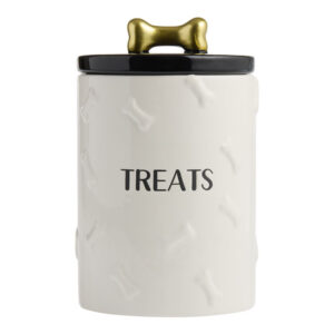 Our pet-treat canister is made of ivory ceramic with an embossed design, an airtight lid in contrast black and a bone-shaped handle in glam gold. A new countertop marvel for your dogs or cats to stare at in hopeful expectation, this pet-food container replaces storebought treat bags with a chic artisan design. Keeping dog chews…