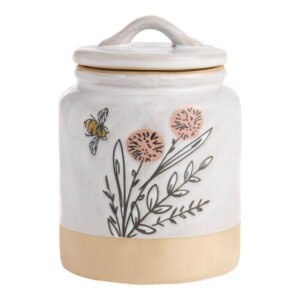 Crafted of speckled stoneware with a natural clay base, our ivory wax-resist storage container is hand painted with our floral artwork featuring a busy honeybee. The skillfully applied wax resist creates the elegant colors and multilayered dimension of the lovely flowers and sweet flying bee. Refined yet cozy with the gorgeous organic texture of fine…