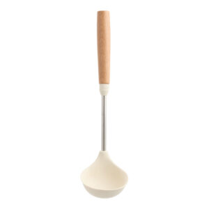 This attractive ladle features a stainless-steel head encapsulated in cream-toned silicone and a rounded wooden handle. The reinforced-silicone bowl is strong yet flexible, safe for high heats and won’t scratch nonstick cookware. Balanced with a smooth, comfortable handle, this durable mixed-material kitchen utensil combines elegant design with modern cooking performance.