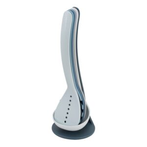 This innovative Joseph Joseph utensil set includes six assorted spoons and spatulas for sauteing, stirring and serving that store neatly on a compact carousel. These clever kitchen tools feature weighted handles and built-in rests that keep their silicone heads from touching your work surface. Available in sky-blue and sage-green colors, the dishwasher-safe utensils stay organized…