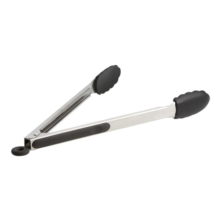 Our exclusive serving tongs are crafted of durable stainless steel with scalloped silicone heads and ergonomic grips in classic black. These heat-resistant cooking essentials won’t scratch nonstick pots pans and are dishwasher safe for easy cleanup. They feature a locking handle to save space in a drawer and a loop handle for hanging from a wall in small kitchens.
