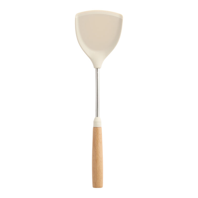 This attractive turner features a stainless-steel head encapsulated in cream-toned silicone and a rounded wooden handle. The reinforced-silicone spatula head is strong yet flexible, safe for high heats and won’t scratch nonstick cookware. A thin beveled edge makes it easy to flip and serve hot foods. Balanced with a smooth, comfortable handle, this durable mixed-material kitchen utensil combines elegant design with modern cooking performance.