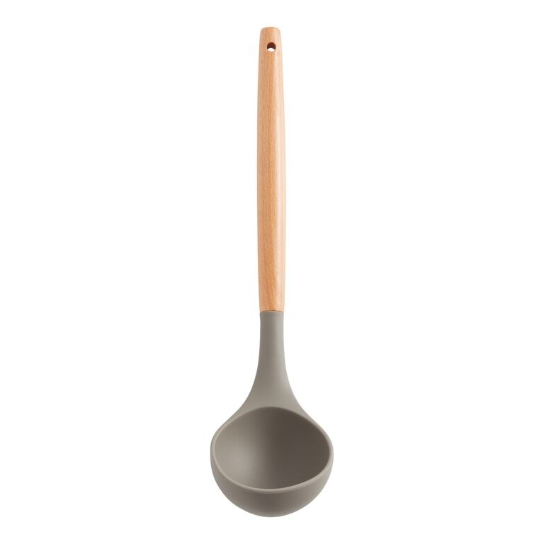 A well-made utensil with a chic style, this two-tone cooking ladle pairs a heat-safe silicone head in smooth gray with a natural wood handle. The rounded handle is always comfortable and the silicone bowl stirs and scoops without scratching nonstick pots or pans.