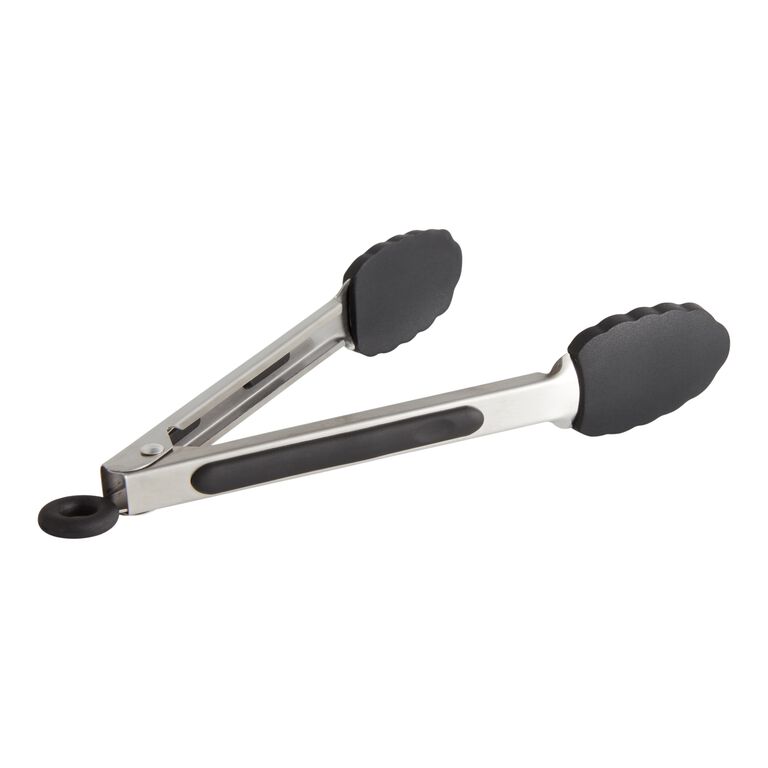 Our mini serving tongs are made of durable stainless steel with scalloped silicone heads and ergonomic grips in black that are safe for nonstick cookware. Sized to grip and lift small foods while cooking or serving, they’re easier to handle than larger tongs and dishwasher safe for easy cleanup. Compact with a locking loop handle, these petite tongs will store neatly in a drawer or can hang on the wall in small kitchens.